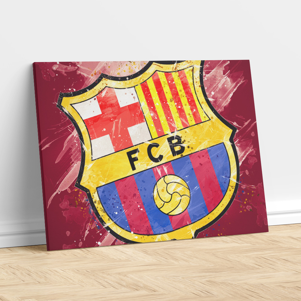 Premium ready made canvas print featuring the FC Barcelona emblem with a bold splash-painted background. Available in 45x30cm, 60x40cm, 75x50cm, 90x60cm and 120x80cm sizes with mirrored 2cm edges. Ready to hang with free delivery across Malta and Gozo. Website Only Orders at these prices.