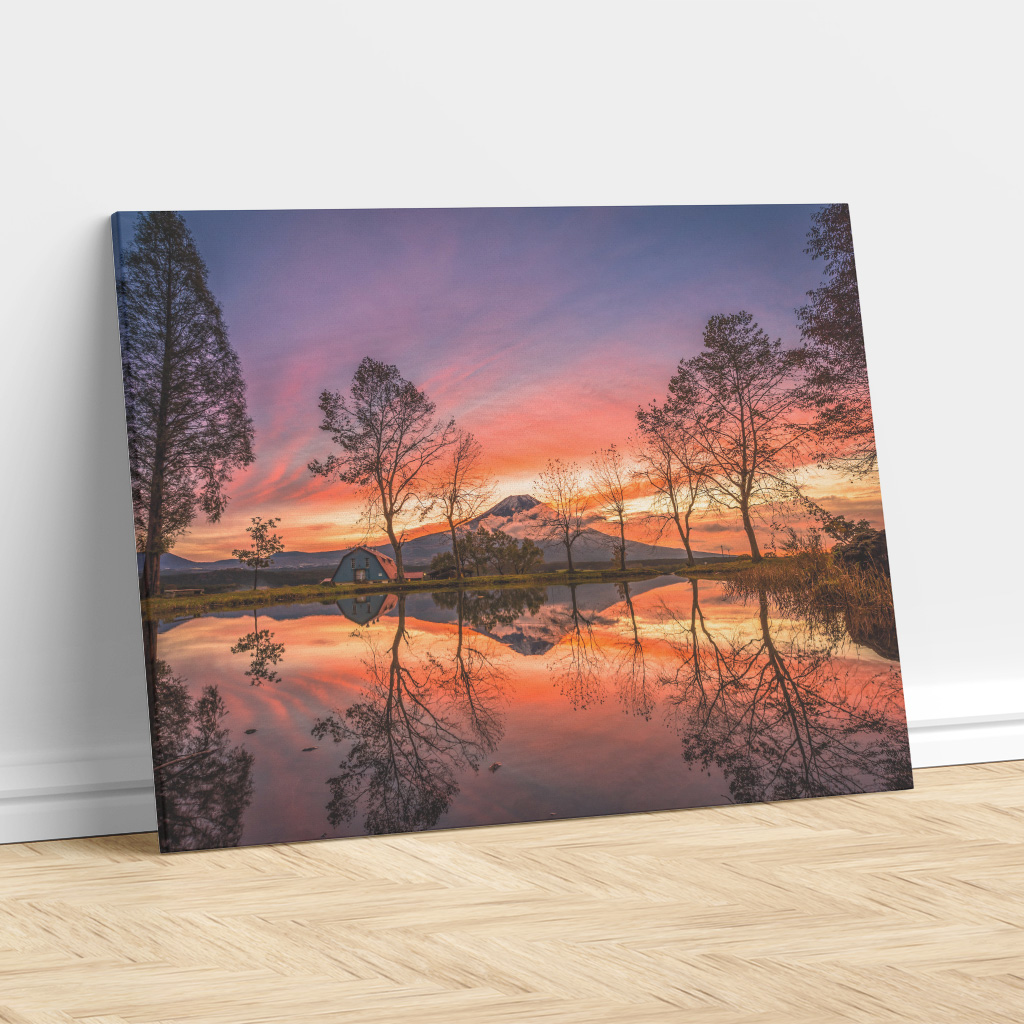 Premium ready made canvas print featuring the radiant sunrise over Mount Fuji reflected on still waters in Shizuoka, Japan. Available in 45x30cm, 60x40cm, 75x50cm, 90x60cm and 120x80cm sizes with mirrored 2cm edges. Ready to hang with free delivery across Malta and Gozo. Website Only Orders at these prices.