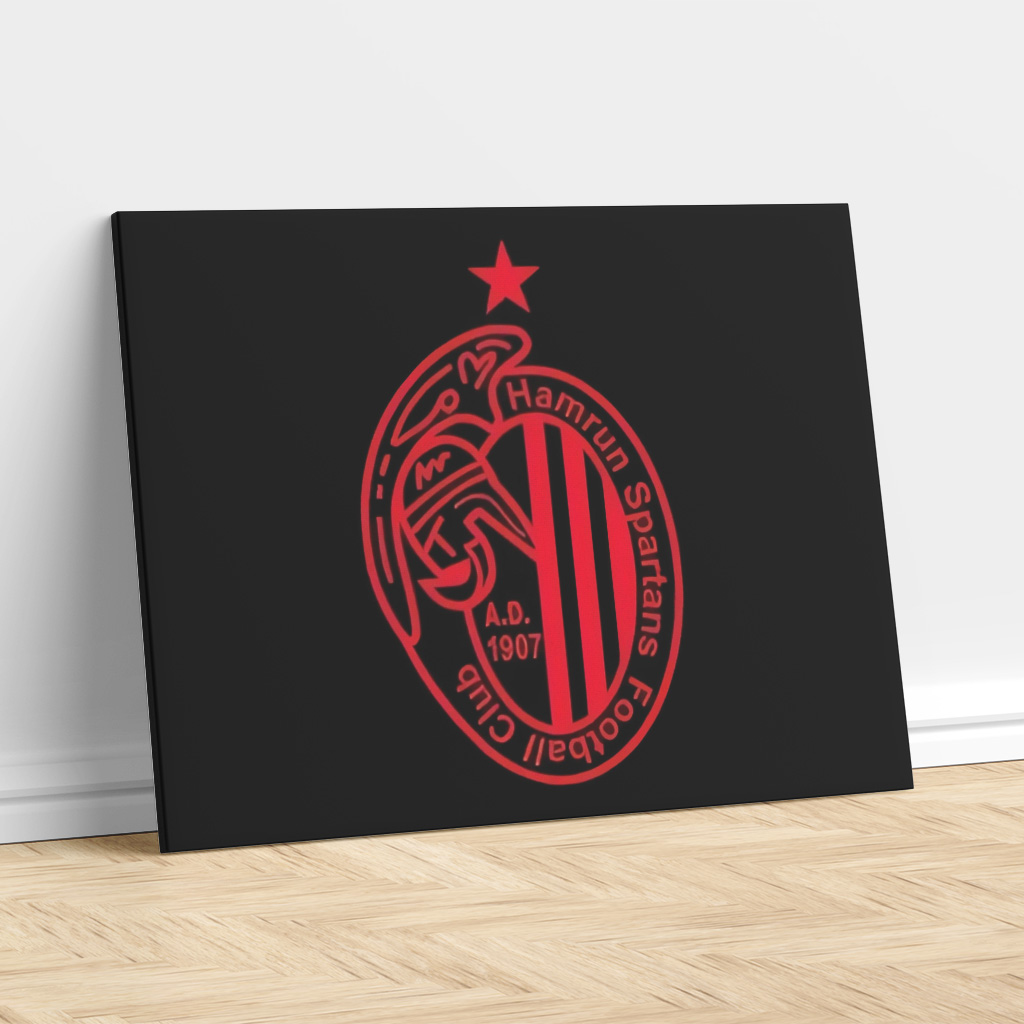 Premium ready made canvas print featuring the bold red and black crest of Ħamrun Spartans F.C. on a deep black background. Available in 45x30cm, 60x40cm, 75x50cm, 90x60cm and 120x80cm sizes with mirrored 2cm edges. Ready to hang with free delivery across Malta and Gozo. Website Only Orders at these prices.