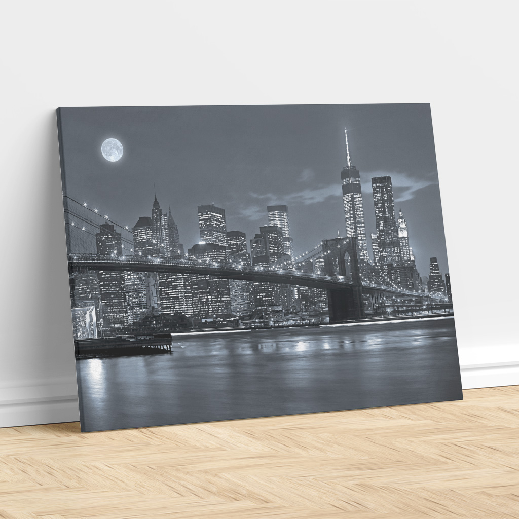 Embrace the timeless allure of the city that never sleeps with this premium ready made canvas print featuring Midnight Skyline – Brooklyn Bridge, New York City. Captured under a moonlit sky, this striking black-and-white composition highlights the glowing Manhattan skyline, the graceful lines of the Brooklyn Bridge and the dynamic spirit of New York. A dramatic and sophisticated artwork that brings urban elegance into any space. As Malta’s leading canvas manufacturer, we deliver gallery grade pieces at heavily reduced prices while keeping the highest level of quality.