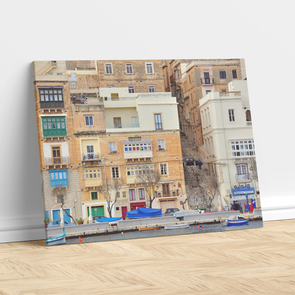 Premium ready made canvas print featuring Valletta’s iconic seaside architecture with golden limestone façades and traditional Maltese balconies. Available in 45x30cm, 60x40cm, 75x50cm, 90x60cm and 120x80cm sizes with mirrored 2cm edges. Ready to hang with free delivery across Malta and Gozo. Website Only Orders at these prices.